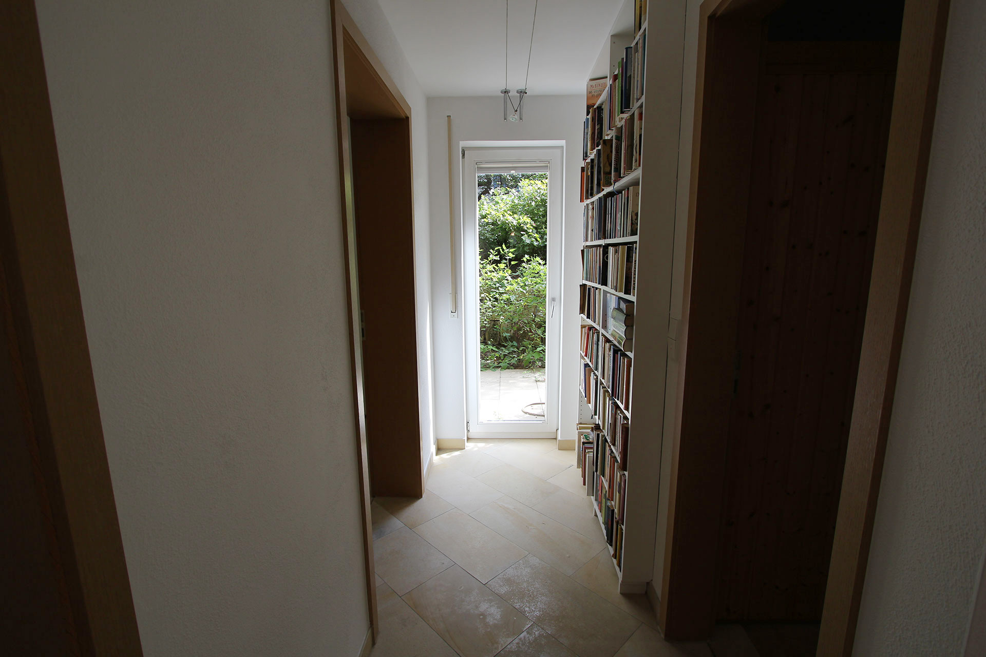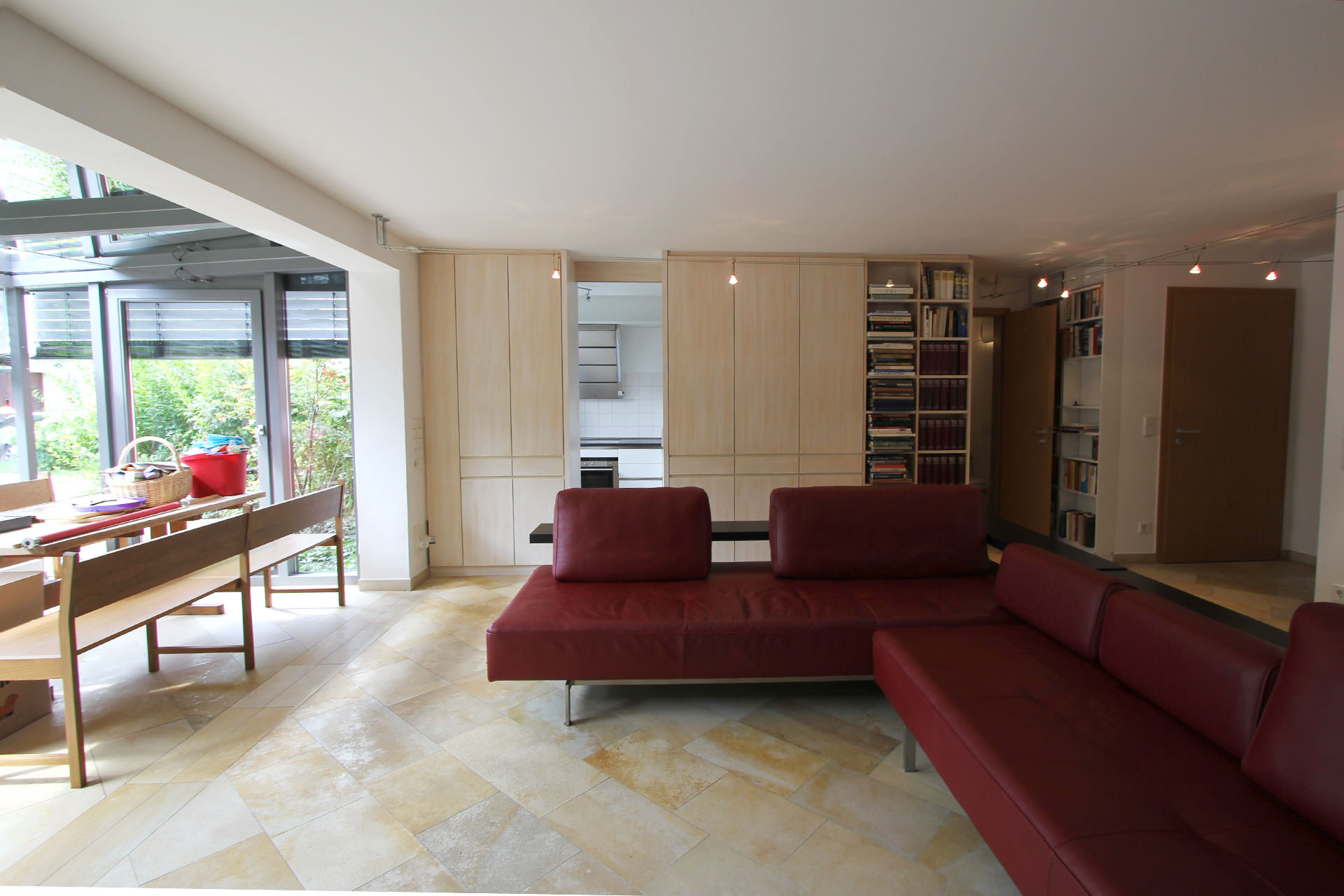 Spüren Sie Natursteinboden bzw. in den Schlafzimmern Teppich – mit wärmender Fußbodenheizung; Wintergarten und Wohnbereich verschatten elektrische Jalousien.